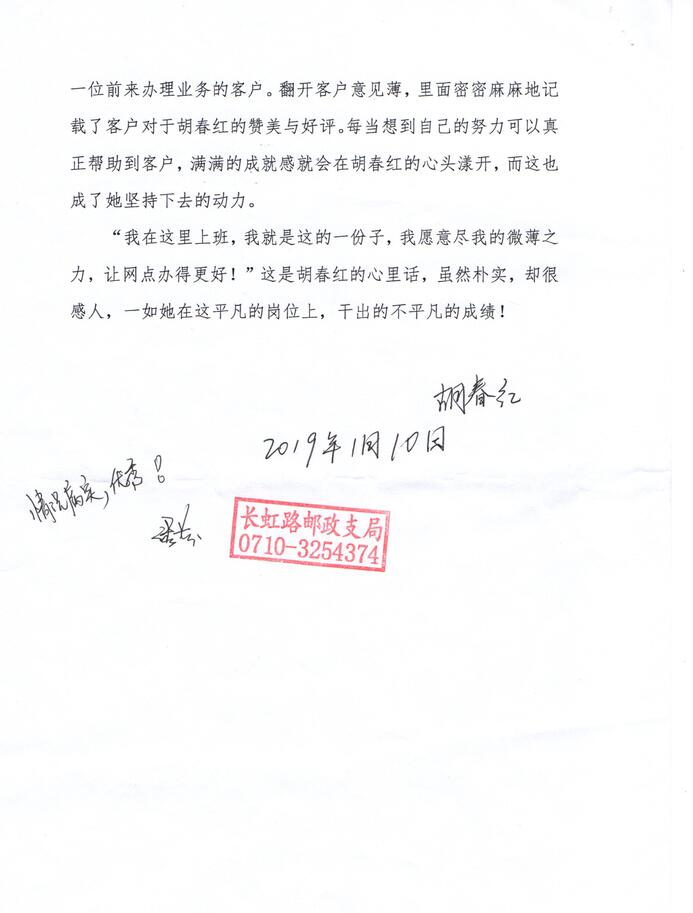 還有一次,一對老夫妻來網(wǎng)點辦理業(yè)務,老大大心臟病突發(fā),動彈不得,胡春紅二話沒說撥打了120急救電話,又是遞上熱水又是幫忙攙扶她到座椅上休息,然后,她想也沒想就跑到最近的藥店,自費買了一盒速效救心丸,在稍事休息后老太大有所好轉事后,老兩口多次來到網(wǎng)點要把藥費還給胡春紅,都被她拒絕了,最終,老大大親自寫了整整兩頁紙的感謝信,交到了胡春紅手中。將客戶遺失在網(wǎng)點的物品及時收起來,妥善保管,待客戶來時物歸原主;主動給客戶講解宣傳存款政策,幫助網(wǎng)點提升業(yè)績……這樣的事跡還有很多,胡春紅用她的熱情、真誠感染著每一位前來辦理業(yè)務的客戶。翻開客戶意見薄,里面密密麻麻地記載了客戶對于胡春紅的贊美與好評,每當想到自已的努力可以真正幫助到客戶,滿滿的成就感就會在胡春紅的心頭漾開,而這也成了她堅持下去的動力。“我在這里上班,我就是這的一份子,我愿意盡我的微薄之力,讓網(wǎng)點辦得更好!”這是胡春紅的心里話,雖然樸實,卻很感人,一如她在這平凡的崗位上,干出的不平凡的成績!